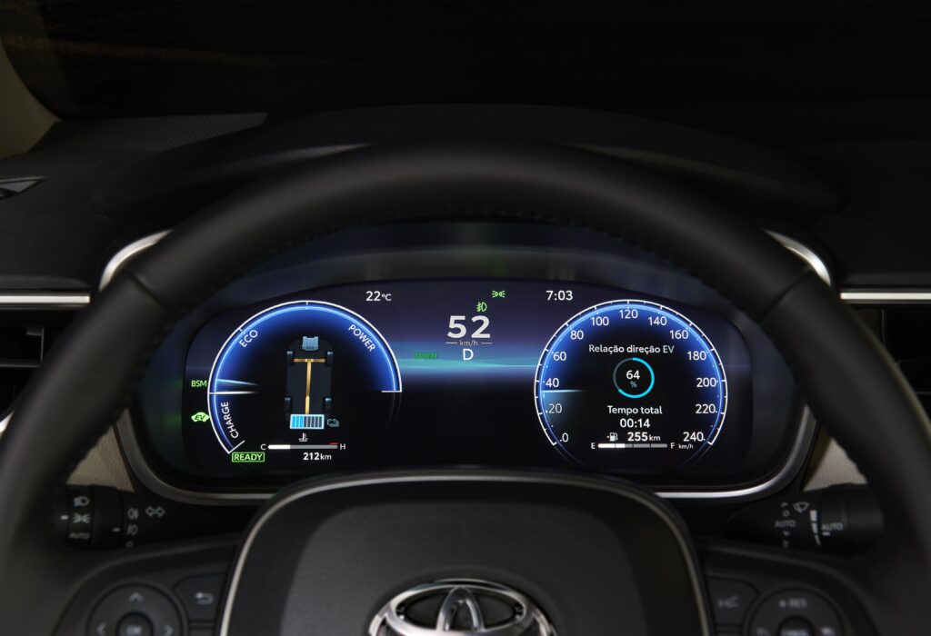 O quadro de instrumentos ganhou o tão esperado display digital, de ótima resolução, que não emite reflexos e permite uma excelente visualização dos indicadores, mas que segue um layout que lembra o da versão anterior analógica. Típico do Corolla. Mudar, mas não tanto.